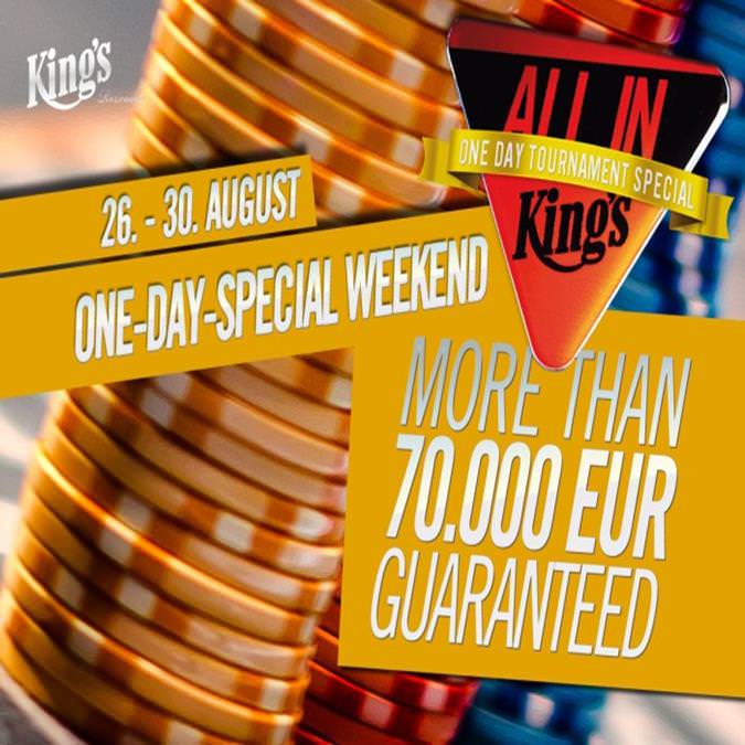 Das absolute Highlight des Wochenende ist das „King’s 1-Day Special THNL“ Event, welches am Samstag den 28. August 2015 um 15:00 Uhr beginnt. Bei diesem Turnier geht es mindestens um ein Preisgeld in Höhe von €40.000 und das für ein Buy-In von €100. Die Spieler starten mit 20.000 in Turnierchips und jeder Level dauert 30 Minuten. Es gibt die Möglichkeit zwei Re-Entries zu tätigen.