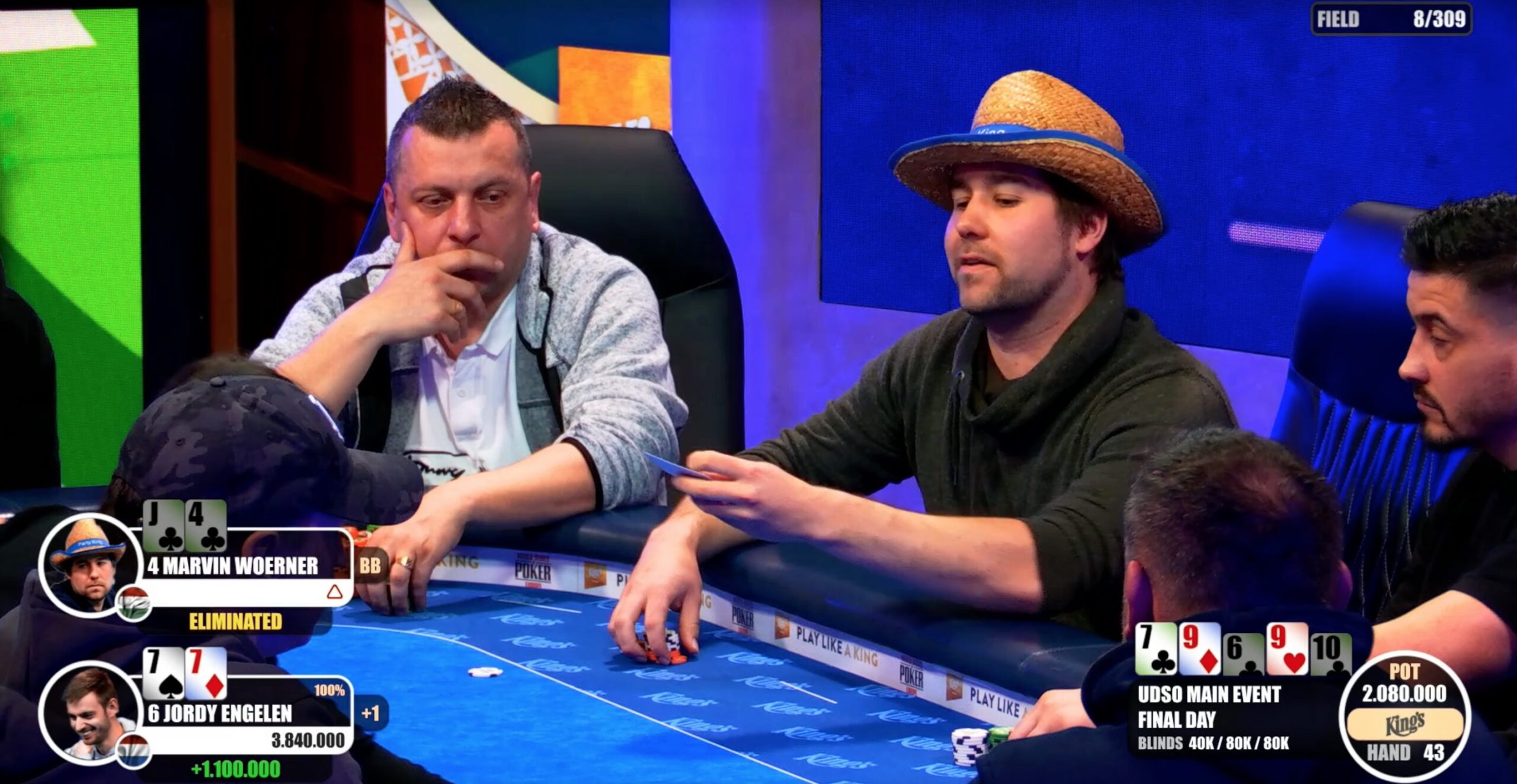 Ihm folgte der Deutsch-Ungar Marvin Wörner. Der konnte zwar mit einem Preflop All-In mit ATo gegen dann Call von Jiri Heidtke mit 53s noch aufdoppeln, aber das Ende kam 41 Hände später mit einem geriverten J-High-Flush-Call (mit J-4s) gegen das geturnte Full House Siebener über Neuner des Niederländers Jordy Engelen (mit 77). Dafür musste Wörner auf Platz 8 für €3.850 seinen Platz am FT verlassen, während Engelen zwischenzeitlich Kopf-an-Kopf mit Martin Schneider den Chiplead übernahm. Alle anderen 5 Spieler lagen dagegen Chip-Bereich unter 15BBs.