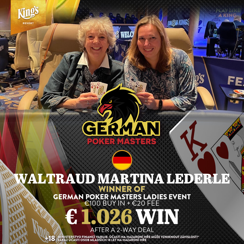 Neben dem GPM Main Event wurden am Samstag im King’s Resort Rozvadov auch noch 3 weitere Events ausgetragen. Im German Poker Masters Ladies Event teilten sich zwei Damen schwesterlich den Sieg. Der Saturday Night BANANA Cup machte in Form eines 9er-Massendeals seinem Namen alle Ehre und im King’s Casino Prague fiel eine königliche Entscheidung im Royal Saturday.
