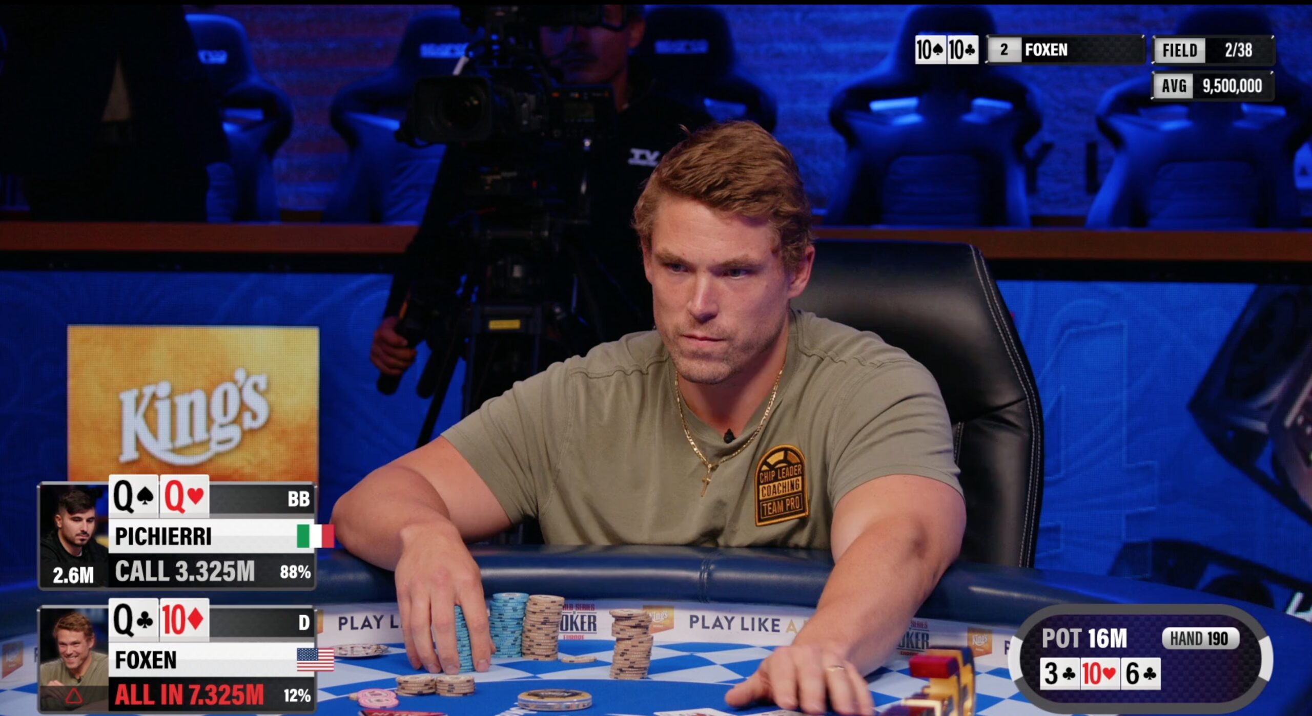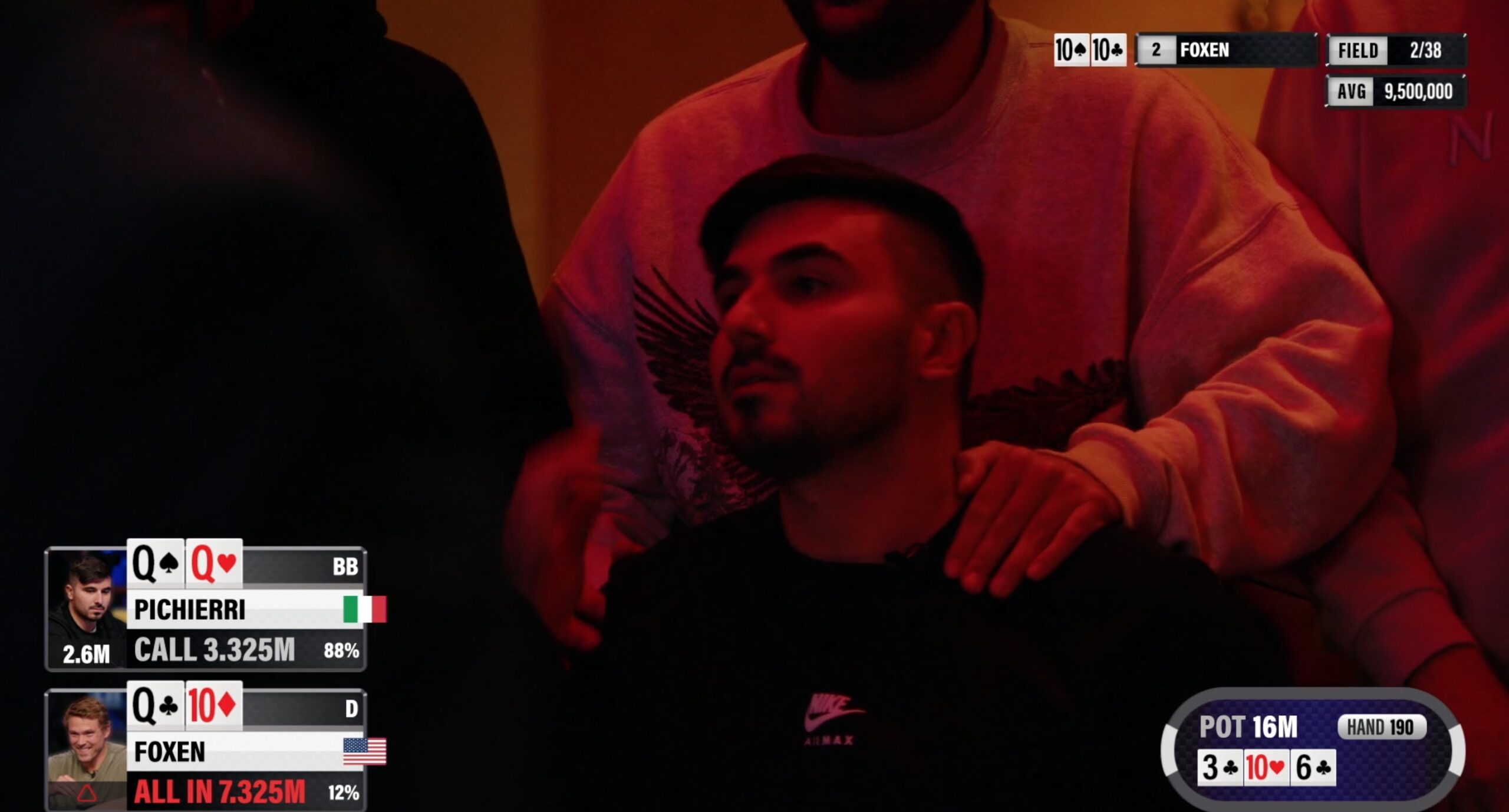 Entspannt konnte Alex Foxen beim finalen All-In jedoch nicht sein: Nachdem Pichierri kurz zuvor zum ersten Mal den Chiplead übernommen hatte, trafen die beiden mit QQ (Pichierri) und QT (Foxen) aufeinander. Es kam, wie es kommen musste, als Foxen den T-high Flop vermeintlich perfekt traf und mit einer 3-Bet all-in ging. Mit dem Snap Call des Italieners mit dem Overpair war klar, dass Foxen Hilfe brauchen würde. Die kam nicht in Form einer der beiden verbleibenden 10en im Deck und bescherte ihm statt seines zweiten Bracelets den Runner-Up-Spot und €223.900.