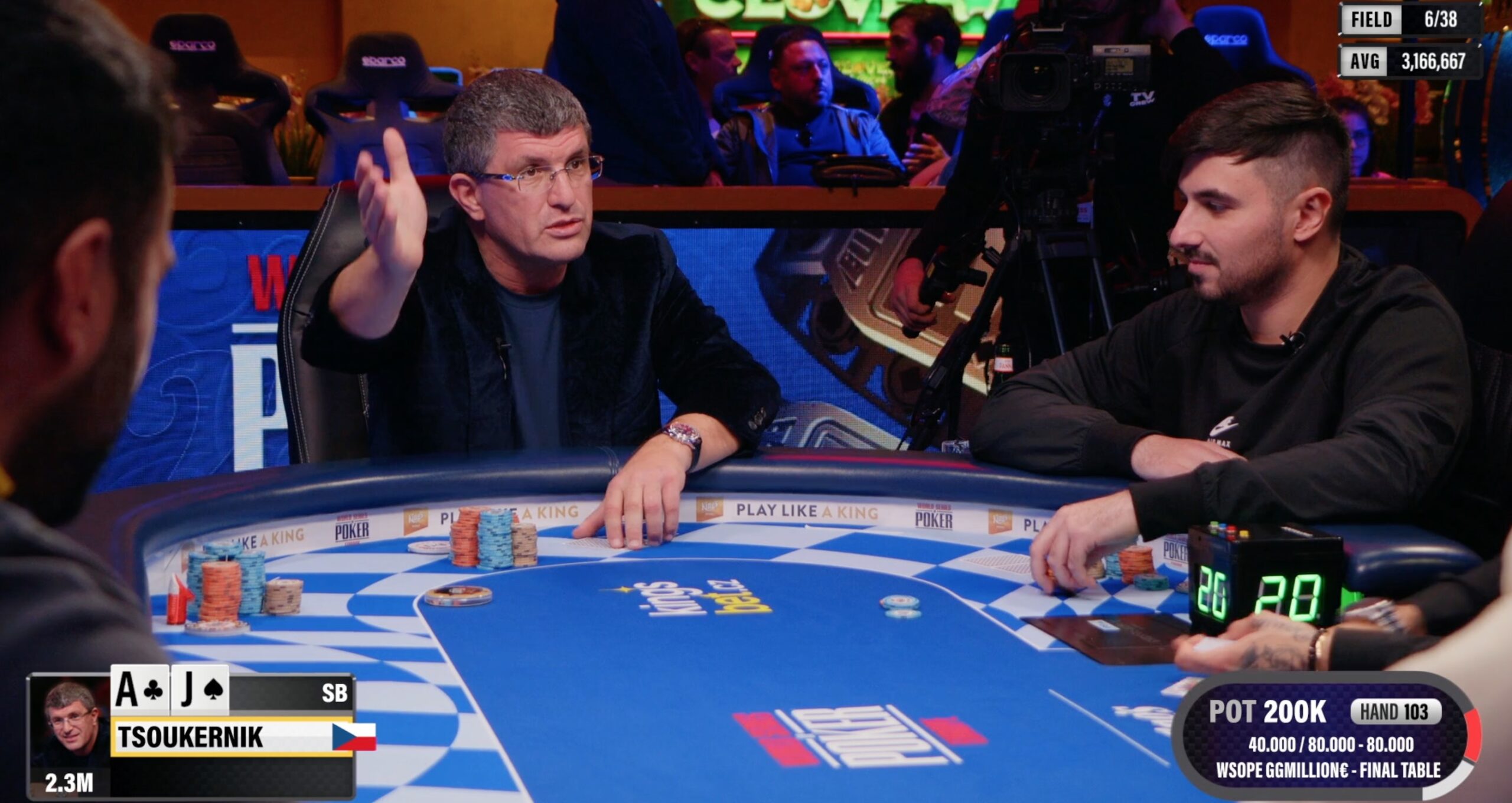 Foxen hatte bis hierher klar die meiste Action im Laufe des Turniers gemacht, musste die Rolle des Table Captains aber zwischenzeitlich an King’s Gründer Leon Tsoukernik abgeben. Dieser bustete zuerst den Deutschen Sirzat Hissou auf Rang 6 (€65.000) und konnte danach mit einem geturnten Set 6en zum Chipleader Foxen aufschließen. Tsoukernik war es auch, der dann Alessandro Pichierri gleich zweimal aufdoppelte und einen großen Teil seines Stacks verlor, ehe er den Norweger Tom Bedell auf Rang 5 (€75.500) aus dem Bracelet-Rennen werfen konnte.