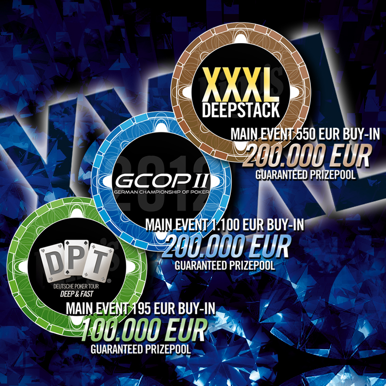 Mit dem XXXL Deepstack wird im Kings der heisse Herbst eingeläutet. Es ist das Eröffnungsevent für das XXXL Poker October Festival. Das Festival hat es in sich: In den 3 Main Events werden insgesamt 500.000 Euro an Preisgeldern garantiert. Gestartet wird mit dem XXXL Deepstack Turnier, das bei einem Buyin von 550 € eine eindrucksvolle Struktur bietet. Gestartet wird an 3 Starttagen mit 500 BB Startingstack. An den Starttagen betragen die Levelzeiten 45 Minuten. Ab Tag 2 wird die Struktur nochmals verbessert und die Levelzeiten auf 60 Minuten ausgeweitet. Bereits beim ersten Deepstack Turnier zeigten sich die Teilnehmer begeistert über diese einmalige Struktur. Das Main Event garantiert 200000 Euro. Starttag 1A beginnt bereits am morgigen Mittwoch, 1B und 1C folgen dann Donnerstag und Freitag. Achtung!! Samstag ist bereits Tag 2 des Turniers, entgegen der vergangenen Turniere kann man am Samstag also nicht mehr in das Turnier einsteigen.