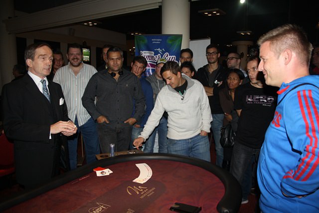 Gestern startete dann auch der Einzelbewerb der diesjährigen Poker Staatsmeisterschaft. 132 Spieler gingen ins Rennen. 37 haben den Tag überstanden und kämpfen heute um den Titel des österreichischen Staatsmeisters. Im Zuge der Staatsmeisterschaft feierte gestern auch die APSA ihr 7-jähriges Bestehen mit Torte und Sekt. Zauberer Magic Christian kam vorbei und überraschte nicht nur die APSA Mitglieder, sondern alle Montesino Gäste mit einer spontanen Pausenshow.