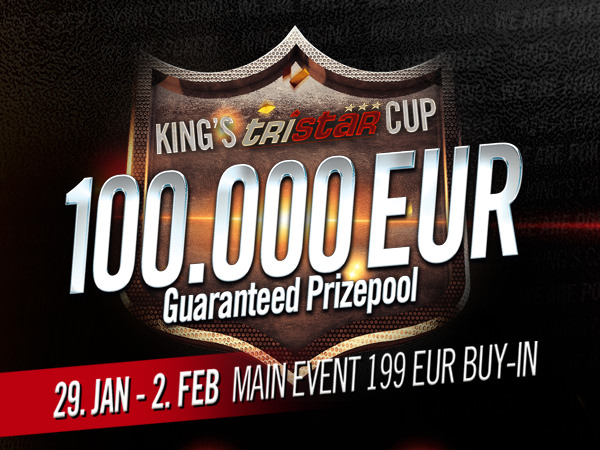 In dieser Woche steht im King’s Casino Rozvadov der „King’s tristar Cup“ (29.1. bis zum 2.2.) auf dem Turnierprogramm. Beim 199 Euro Main-Event wird in Europas Top-Poker-Location um einen garantierten Preispool von 100.000 Euro gespielt. Drei Starttage (1a, 1b und 1c) werden beim Main-Event ab morgen bis Samstag (30. Januar bis zum 1. Februar) angeboten. Gestartet wird mit 50.000 Chips (1000 Big Blinds), die Levels dauern durchgehend 30 Minuten. Ein Buy-In und zwei Re-Entries sind im Verlauf aller Starttage gestattet. Das Finale beginnt am Sonntag, dem 2. Februar, um 13 Uhr.