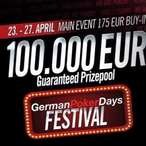 Eröffnet wird das German Poker Days Festival am Mittwoch, den 23. April, um 20 Uhr mit dem King’s Route 66 NLH Freezeout (Buy-In: 66 Euro). Im Preispool liegen garantierte 6.666 Euro. Gespielt wird mit 25-Minuten-Levels und 12.000 Chips als Startstack.