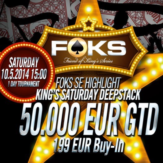 Am kommenden Freitag, dem 9. Mai, wird beim King’s Big Friday Deepstack NLH um einen garantierten Preispool von 20.000 Euro gespielt. Dieses “One Day Tournament” beginnt um 19 Uhr. Das Buy-In beträgt 113 Euro. Um 20 Uhr steht das FOKS Turbo Satellite (Buy-In: 25 Euro) auf dem Programm. Acht Seats zum Main Event der FOKS sind garantiert. Um 22 Uhr bekommt man für ein Buy-In von lediglich 250 Euro die Chance den Day 1 des Main Events der Friend of King’s Series zu spielen.