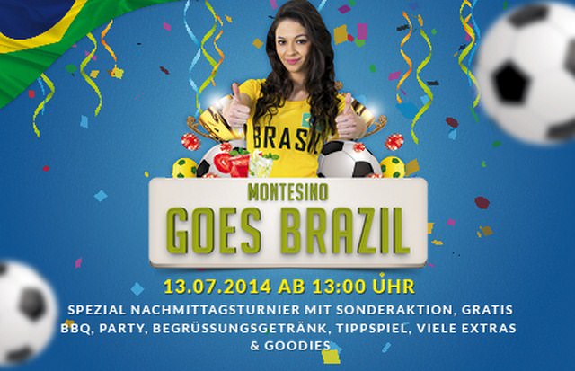 Am Sonntag, den 13. Juli 2014 ist es endlich soweit. Die Finalisten treten im Estádio Maracanã in Rio de Janeiro an, um den Weltmeister 2014 zu küren. „Montesino goes Brazil“ heißt es an diesem Tag im Pokertainmentcenter. Auf der Tagesordnung stehen jede Menge Spiele und Spaß. Neben einem Special Nachmittagsturnier mit BBQ erwartet die Spieler ab 13.00 Uhr ein Begrüßungsgetränk, das beliebte Tippspiel und jede Menge Extras, Überraschungen und Goodies.