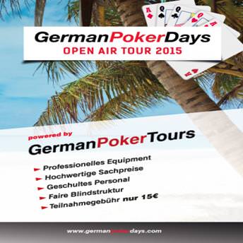 Im August 2015 finden die mittlerweile dritte German Poker Days Open Air Tour statt. An fünf coolen Locations wird am Wochenende immer ab 14:00 Uhr gespielt. Der Veranstalter bietet bis zu 100 Spielern Platz. Die Late-Registration ist jeweils bis 16:00 Uhr geöffnet. Teilnehmer können sich ab einer Stunde vor Turnierstart Vorort registrieren. Die Teilnahmegebühr beträgt €15.