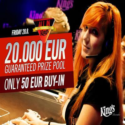 Um 19:00 Uhr heißt es dann „Shuffle up and Deal“ beim „King’s 1 x Rebuy One Day Tournament“. Für ein Buy-In von nur €50 geht es mindestens um einen Preispool von €20.000. Für das Buy-In gibt es eine Startdotation von 10.000 und darüber hinaus hat jeder Teilnehmer die Möglichkeit einen Rebuy für weitere €50 zu kaufen, der 15.000 on Top bringt. Die Level-Dauer beträgt 25 Minuten und die Option des Re-Entry besteht ebenfalls.