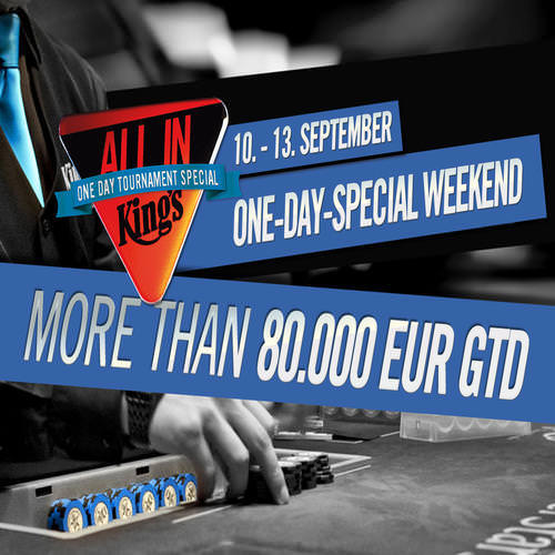 Zwei Turniere stechen an diesem Wochenende besonders hervor. Das eine ist das „King’s €20.000 GTD + 1 x Rebuy THNL“ Event am Freitag den 11. September 2015 um 19:00 Uhr. Hier wird für ein Buy-In von €50 ein Preisgeld von €20.000 garantiert. Die Spieler starten mit 10.000 in Chips und jeder hat die Möglichkeit für €50 einen Rebuy zu erwerben der nochmal 15.000 on Top bringt. Die Levels werden alle 25 Minuten erhöht und der Re-Entry ist auch möglich.