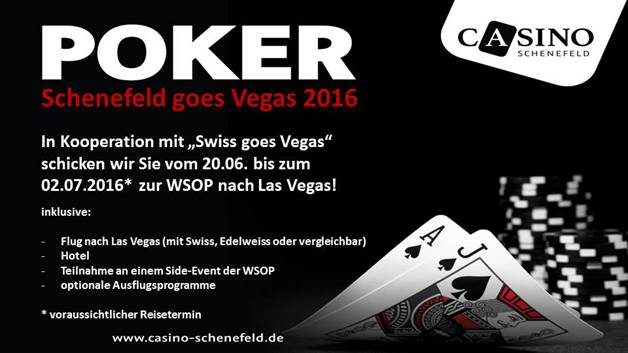 Im vergangen Jahr gab es in der Schweiz die Aktion „Swiss goes Vegas“ die zu einem großen Erfolg wurde. In diesem Jahr findet eine ähnliche Aktion in Zusammenarbeit vom Casino Schenefeld und dem Poker Palace Schweiz statt. Beim „Schenefeld goes Vegas“ Turnier beträgt das Buy-In €550. Davon gehen €300 in den regulären Preispool, €200 in den Vegas-Package Pool und €50 sind Gebühren. Auf die Gewinner warten neben saftigen Preisgelder WSOP Las Vegas Reisen (Termin 20. Juni bis 02. Juli 2016) im Wert von je €3.300. Im Package enthalten sind, Flug, Hotel, Ausflüge und ein WSOP Side Event Buy-In. Das Turnier wird mit zwei Starttagen Eins am Freitag und Samstag gespielt. Turnierstart ist jeweils 18:00 Uhr. Es geht mit 30.000 in Chips (600 Big Blinds) los und die Levels dauern 30 Minuten. An den Tagen Eins werden insgesamt 14 Levels gespielt. Während der ersten vier Levels ist der Re-Entry möglich. Das Finale findet dann am Sonntag ab 16:00 Uhr statt. Im Finale werden die Level-Zeiten auf 40 Minuten erhöht.
