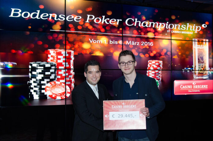 Am Sonntag den 06. März 2016 kamen die besten 31 Spieler von ehemals 92 zurück an die Tische im Austria Casino Bregenz um den Sieger beim €1.000+€80 Bodensee Poker Championship Main Event unter sich auszuspielen. Das erste Ziel des Tages war es, die neun bezahlten Plätze zu erreichen. Der Schweizer Oliver Mader ging als massiver Chipleader ins Finale, doch er erwischte einen rabenschwarzen Tag und musste sich noch vor den Geldrängen verabschieden. Auch Kurt Herman der als zweiter in Chips gestartet war schaffte es nicht ins Geld. Ganz anders lief es da für „MC“ und Jan Loy die den Tag dominierten und sich schließlich tief in der Nacht im Heads Up auf einen Deal einigen konnten. „MC“ durfte sich als Chipleader über den Sieg und €26.905 freuen. Jan konnte für Platz 2 €20.940 seinen Bankroll hinzufügen.