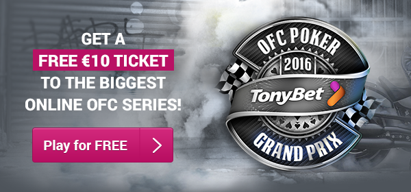 Noch bis zum 15. Mai 2016 läuft auf TonyBet der dritte Open Face Chinese Poker Grand Prix. Zum Abschluss der Turnierserie gibt es am Pfingst-Sonntag um 18:00 Uhr das Wrap-Up Event, bei dem für ein Buy-In von nur €10 ein Preispool von €1.000 garantiert wird. Alle Spieler die mindestens €10 mit dem Bonus Code GRANDPRIX10 einzahlen erhalten für dieses Turnier eine Wildcard. Für Spieler die noch keinen TonyBet Account haben gibt es zusätzlich noch einen Ersteinzahler-Bonus von 100% (bis zu €1.000). Außerdem gibt es täglich Freeroll-Satellite für die OFC Grand Prix Turniere.
