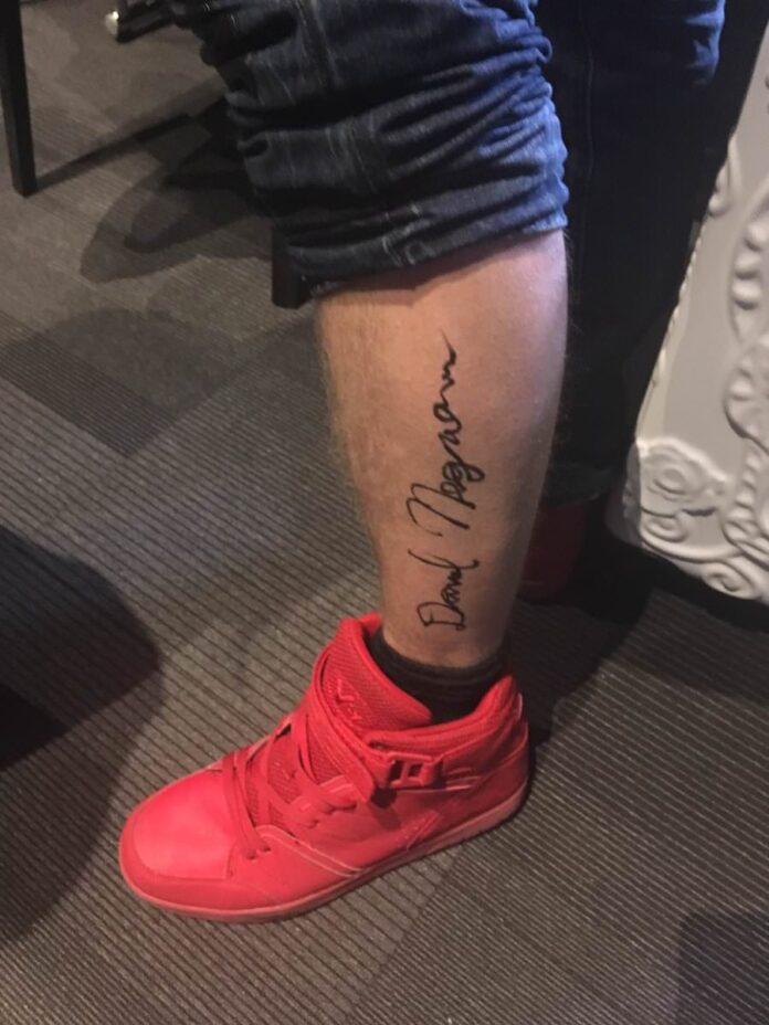 Dort ließ er sich von seiner Tätowiererin Sally-Ann das Autogramm auf den Unterschenkel tätowieren und legte wenig später noch mit weiterem Körperschmuck nach.