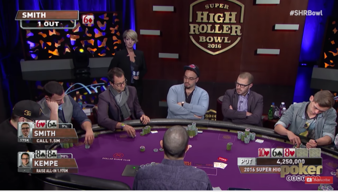 Der Super High Roller Bowl 2016 ist mit acht Spielern auf der Bubble angelangt. Platz 7 bringt den Min-Cash für schlappe $600.000. Aber nicht die Shortstacks kommen in dieser Hand ins Grübeln, sondern Rainer Kempe und Dan Smith rasseln mit reichlich Chips vor sich am Tisch aneinander. Beide treffen auf dem Flop ihr „Set“ und es kommt zum Unvermeidlichen.