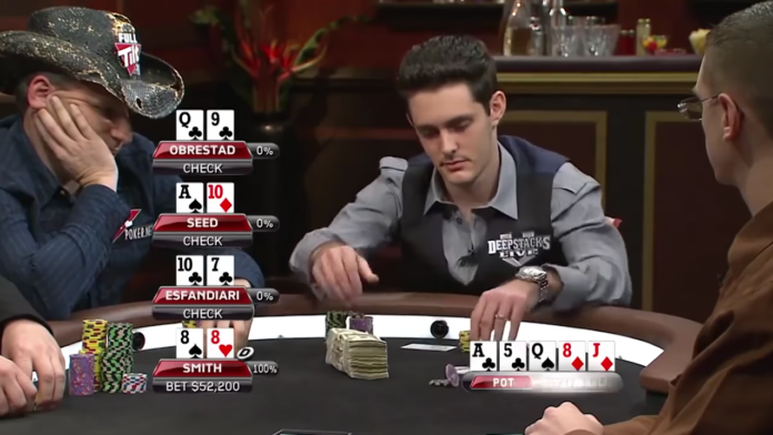 Für sein neuestes Poker-Strategie-Video bedient sich Doug Polk einmal mehr an den Materialien der TV-Show Poker After Dark. Bis zum River verläuft die Hand zwischen Annette Obrestad, Huck Seed, Antonio Esfandiari und Justin Smith auch noch ziemlich normal, jedoch überrascht Justin Smith auf dem River mit einer gewaltigen Overbet. Ziemlich riskant, bedenkt man, dass er bei weitem nicht die Nuts hält.
