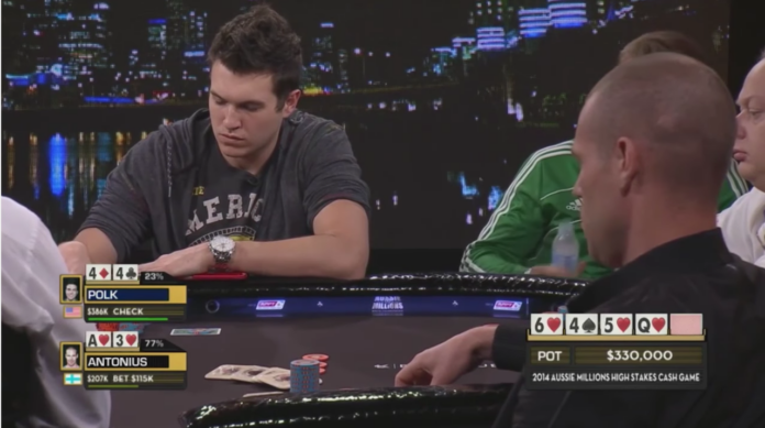 Bei den Aussie Millions 2014 legte sich Doug beim Big Game unter anderem mit Phil Ivey und Patrik Antonius. Gegen den Finnen fand sich der WCGRider dann in einer Hand wieder, in der so manch ein Spieler Haus und Hof verzockt hätte. Letzten Endes verliert Doug Polk mit seinem gefloppten Set nicht allzu viel Geld, obwohl sich der Pott auf immerhin $445.000 aufbaut.