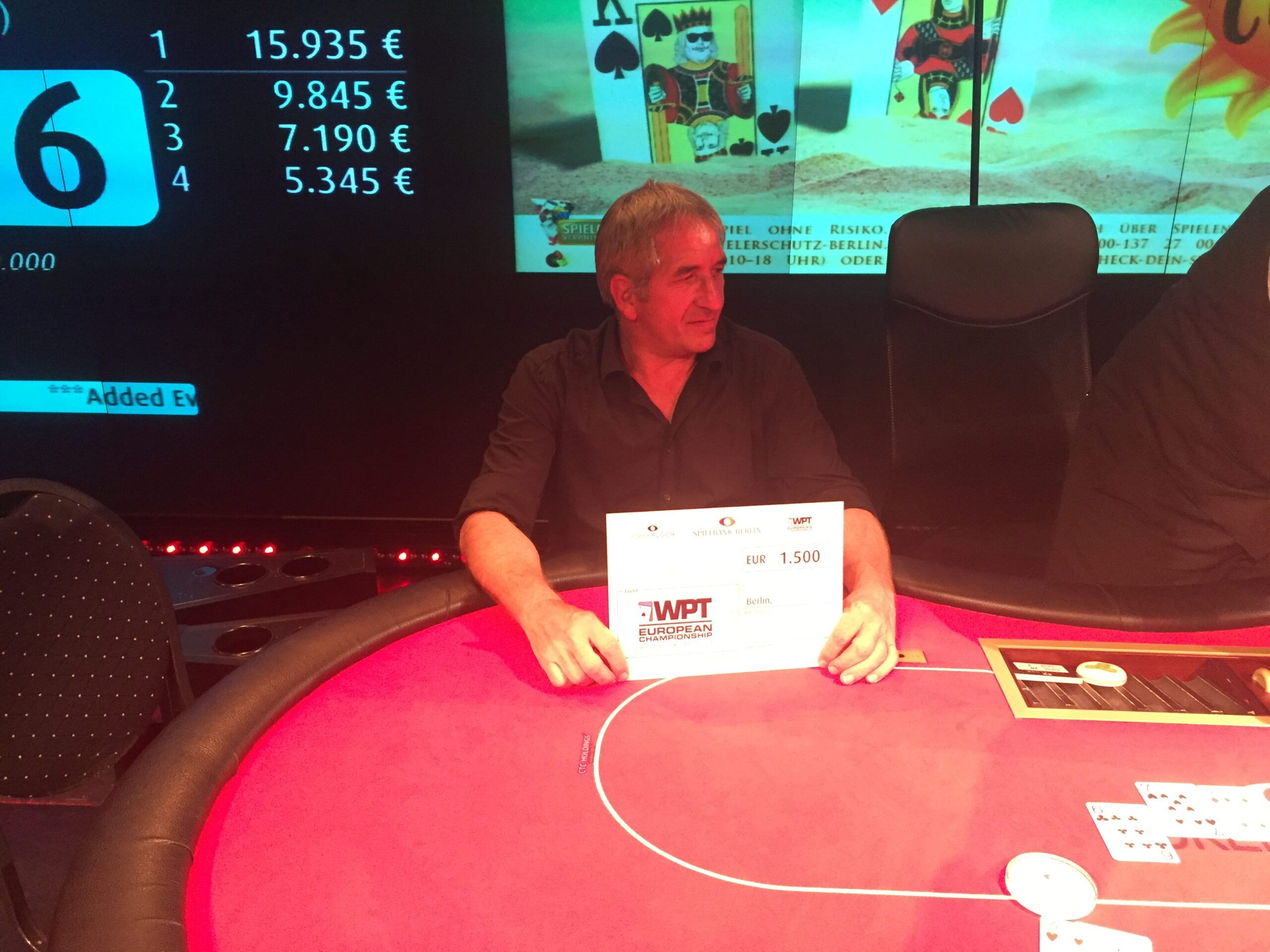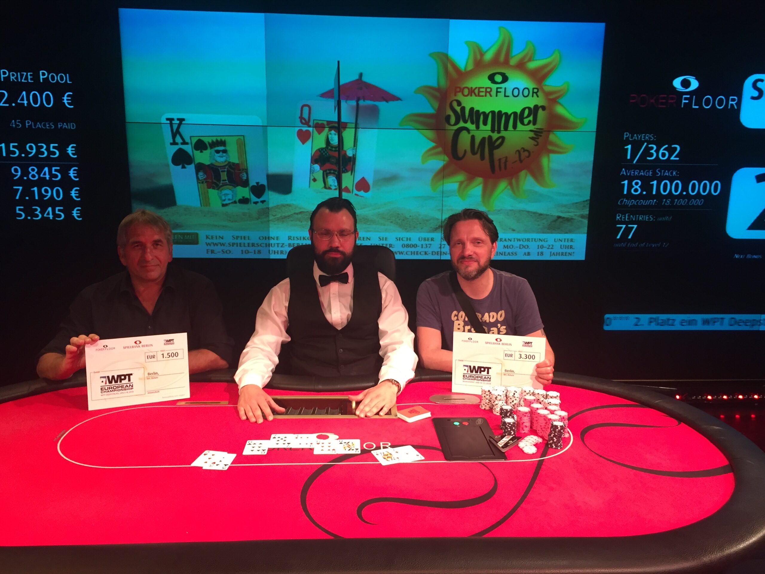 Am Freitag war in der Spielbank Berlin der €200+€20 Summer Cup mit 275 Spielern (+72 Re-Entries) gestartet. 115 Akteure schafften es in Tag 2. Am Samstag ging es dann um 16:00 Uhr weiter. Zehn Spieler machten noch von der Late-Registration gebrauch und fünf nutzten den Re-Entry. Damit kommt man auf insgesamt 362 Entries und die Garantiesumme von €30.000 konnte mit €72,400 massive übertroffen werden. Der Preispool wurde auf 45 Plätze verteilt und der Min Cash brachte €325. Gegen 21:30Uhr stand die Besetzung des Final Table fest. Die zehn Besten einigten sich auf einen ICM-Deal und spielten nur noch um die zwei gesponserten WPT Berlin Tickets. Um kurz nach 01:00Uhr ging der Sieg für €6.250 an „Teufelskerl“ der zusätzlich noch das €3.300 WPT European Championship Main Event Ticket bekam. Runner-Up wurde Fritz für €3.660 der noch ein €1.500 WPT Berlin Deepstack Ticket on Top bekam.