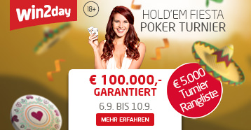 Ab heute beginnt im win2day Poker Room die Hold’em Fiesta Turnierwoche. Bis zum 10. September werden bei insgesamt 10 Turnieren Preisgelder in Höhe von €100.000 garantiert. Zusätzlich schüttet der österreichische Anbieter €5.000 an Poker-Guthaben in den Turnierranglisten aus.