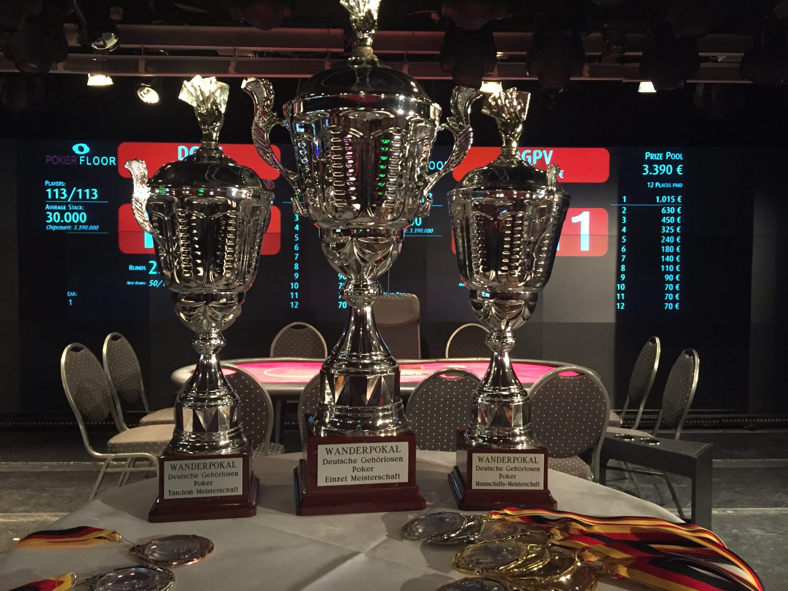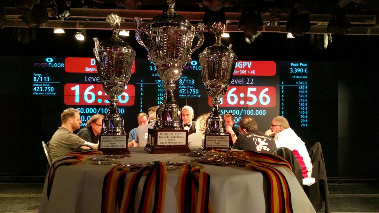 Am Samstag fand in der Spielbank Berlin am Potsdamer Platz die fünfte Auflage der „Deutschen Gehörlosen-Poker-Meisterschaft“ statt. 113 Spieler aus 14 Vereinen trafen sich zum großen Finale des „Deutschen Gehörlosen Poker Verband“ (DGPV) und suchten den Deutschen Meister. Das Buy-In betrug €30+€4 und es ging mit 30.000 in Chips los. Die Levels wurden alle 20 Minuten erhöht. Das Turnier wurde um 16:00uhr gestartet und erst um 00:50Uhr stand mit Torsten Keil (Deaf Poker Oldenburg) der neue Deutscher Meister der Gehörlosen fest. Das Team von Hochgepokert gratuliert.