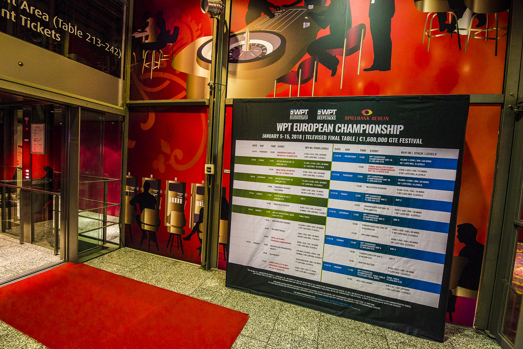 In der Spielbank Berlin startete am Mittwoch der €3.000+€300 World Poker Tour European Championship Main Event mit Tag 1a. Das Turnier garantiert ein Preisgeld von €1.000.000. Am ersten von zwei Starttagen Eins kauften sich 101 Pokercracks in das Turnier ein und zehn von ihnen machten noch vom Re-Entry Gebrauch. Damit hat man schon mal einen anständigen Start in das Event. Es ging los mit 30.000 in Chips und am Tag 1a wurden acht Levels à 60 Minuten gespielt. Wie zu erwarten war, war die deutschsprachige Poker Szene stark vertreten. Unter den 47 Spielern die den Tag überstanden waren noch 17 Deutsche, zwei Österreicher und ein Schweizer. Besonders erfreulich war das Gerald Karlic (AUT) mit 182.800 (228,5 Big Blinds) den Chiplead vor Ole Schemion (GER) mit 160.000 (200 Big Blinds) holen konnte. Außerdem schafften es Big Names wie Maxi Lehmanski (GER), Thomas Mühlöcker (AUT), Paul Höfer (GER) oder auch Dominik Nitsche (GER) heil durch den Tag. Auf der Strecke blieben hingegen Spieler wie Marvin Rettenmaier (GER) oder Paul Michaelis (GER).