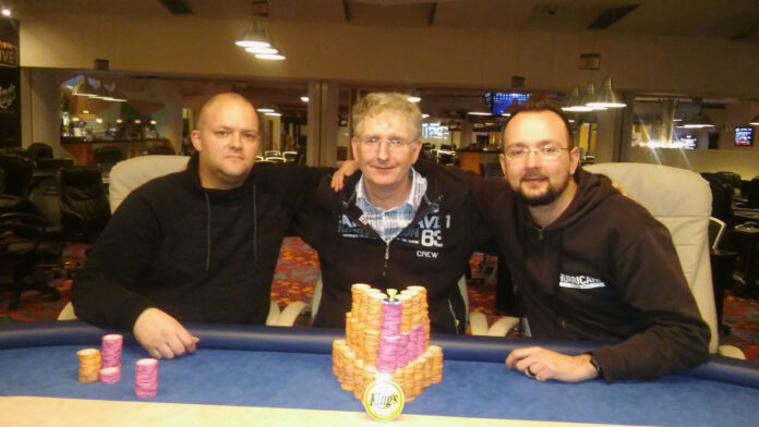Am Freitag Abend wurde erneut das beliebte Friday Deepstack für ein Buy-in von €90+€10 angeboten. Der garantierte Preispool in Höhe von €10k wurde mehr als gesprengt, denn es kauften sich 339 Spieler ein und 40 Re-Entries wurden bezahlt. Somit warteten €32.404 Preispool auf die Teilnehmer. Als nur mehr drei Spieler (Foto) am Final Table saßen einigte man sich auf einen Deal. Jeder Spieler erhielt jeweils €4.657, auch der Deutsche Marcel Kruger.