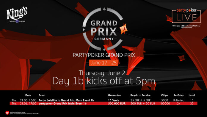 Der zweite von insgesamt sieben Live-Starttagen Eins des €200+€20 partypoker Live Grand Prix Germany Main Event beginnt um 17:00Uhr. Bei dem Turnier geht es um einen garantierten Preispool von €500.000. Die Teilnehmer erhalten eine Startdotation von 100.000 und es werden an den Starttagen Eins immer 18 Levels à 30 Minuten gespielt. Die Late-Registration ist für 12 Levels geöffnet und es sind pro Tag zwei Re-Entries erlaubt. Der Tag 2 findet dann am kommenden Sonntag um 14:30Uhr statt.