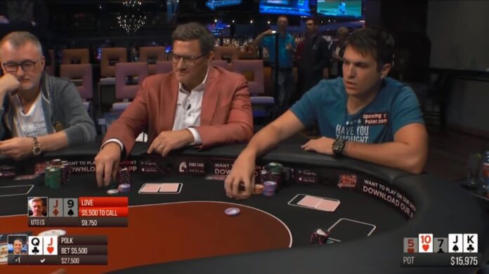 In einer Runde mit Blinds von $25/$50 und Spielern wie Shaun Deeb and Frank Kassella zeigt Polk, dass er nicht viel braucht, um dreimal durchzubarreln.