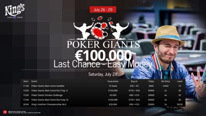 Neben den beiden Main Event Flights ab 13:00 Uhr und ab 17:00 Uhr mit einem Buy-in von jeweils €150+€20, 50.000 Starting Stack und 30 Minuten pro Level, findet ab 11:00 Uhr ein Main Event Satellite für €35+€5 Buy-in statt mit 10 Seats garantiert. Um 15:00 Uhr beginnt die Poker Giants Omaha Challenge mit €80+€10 Buy-in und €3.000 GTD und den Abschluß macht ab 20:00 Uhr das King’s Hold’em Championship mit €20.000 im garantierten Preispool für ein Buy-in von nur €90+€10. Sämtlichen weiteren Informationen findet ihr auf der King’s Casino Homepage: