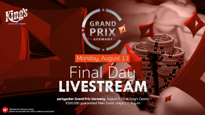 Am Montag um 13:30Uhr geht es im King’s Rozvadov mit dem Finale des €200+€20 partypoker Grand Prix Germany los. Der Stream wird 30 Minuten zeitversetzt mit Hole Cards übertragen. Kommentiert wird die Übertragung auf Deutsch von Stefan Hachmeister und Gastkommentatoren.