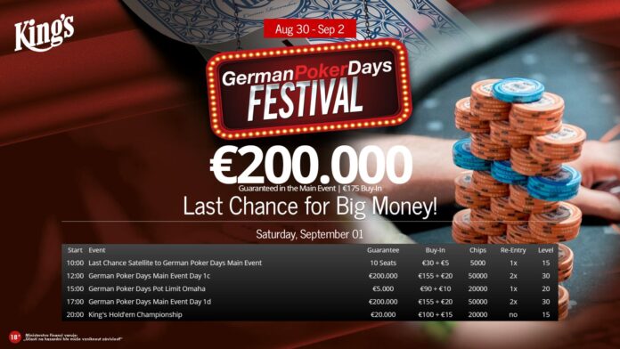 Als Chipleader beendete gestern der Deutsche Christoph Bahrs mit 926.000 Chips den Tag vor Nikolas Kvasai aus der Slowakei mit 914.000 Chips. Insgesamt konnten sich 65 weitere Spieler für das Finale am Sonntag qualfizieren. Heute ab 10:00 Uhr können sich Spieler beim €30+€5 Last Chance Satellite für das Main Event versuchen, 10 Seats werden garantiert. Ab 12:00 Uhr startet Tag 1c und ab 17:00 Uhr habt ihr die letzte Möglichkeit euch für €155+€20 in Tag 1d einzukaufen.