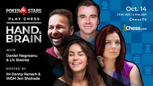 Die beiden Pokerprofis spielen dabei ein sogenanntes „Hand-and-Brain-Match“, das so abläuft. Die beiden Schachmeister sagen den Pokerprofis, welche Figur sie ziehen sollen, und diese müssen dann entscheiden, auf welchem Feld die Figur platziert werden soll.