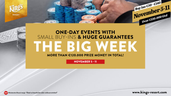 Heute wird bereits ab 12:00 Uhr das Noon Turbo mit einem Buy-in von €45+5 angeboten, ab 15:00 Uhr startet das €50.000 GTD Big Saturday mit einem Buy-in von nur €135+€15 und ab 19:00 Uhr findet das Big Omaha mit €5.000 im garantierten Preispool und einem Buy-in von €100+€10 statt. Sämtlichen weiteren Informationen findet ihr auf der King’s Resort Homepage: