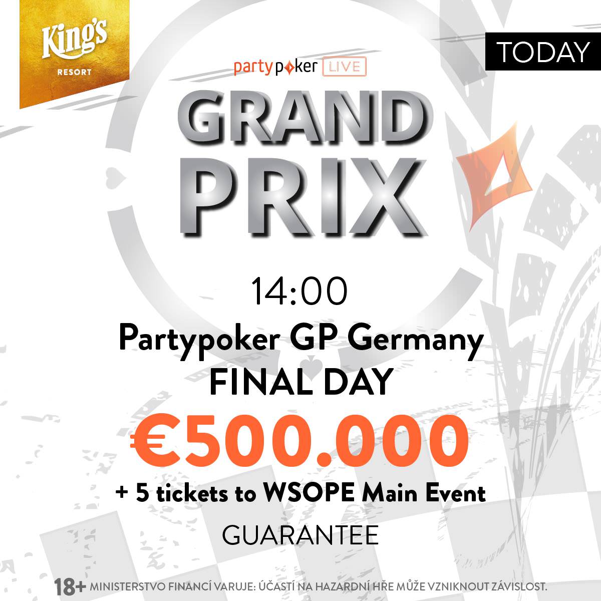 | Sat 23.02. 12:00 | partypoker Grand Prix Million King’s – Day 1E | 1.103.500 EUR | 500 EUR | 50 EUR | ||