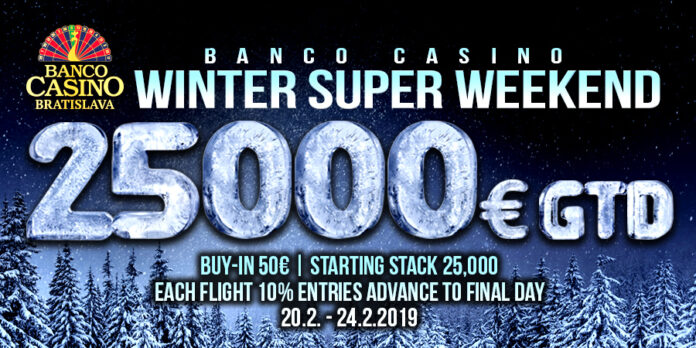 Vom 20. – 24. Februar ist das Banco Casino Bratislava wieder Treffpunkt für alle Pokerfans. Das Winter Super Weekend steht vor der Tür und lockt mit einem garantierten Preispool von €25.000. Für ein Buy-In nur €50 werden bis Sonntag sechs Starting Flights angeboten. Die besten 10% eines Tages ziehen jeweils in das Finale ein und haben dann bereits ein Preisgeld sicher. Jeder Starttag beginnt mit 25.000 Chips. An den vier regulären Starttagen dauern die Blindlevel 30 Minuten. Samstag und Sonntag werden Turbo bzw. Hyperturbo Starttage gespielt mit Blinds von 15 bzw. 10 Minuten. Das Finale steigt am Sonntag ab 16 Uhr.