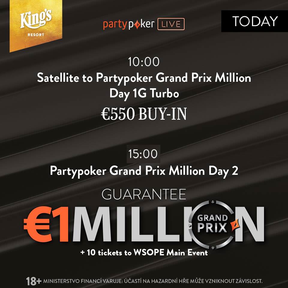 | Sun 24.02. 10:00 | partypoker Grand Prix Million King’s – Day 1G TURBO | 1.103.500 EUR | 500 EUR | 50 EUR | ||