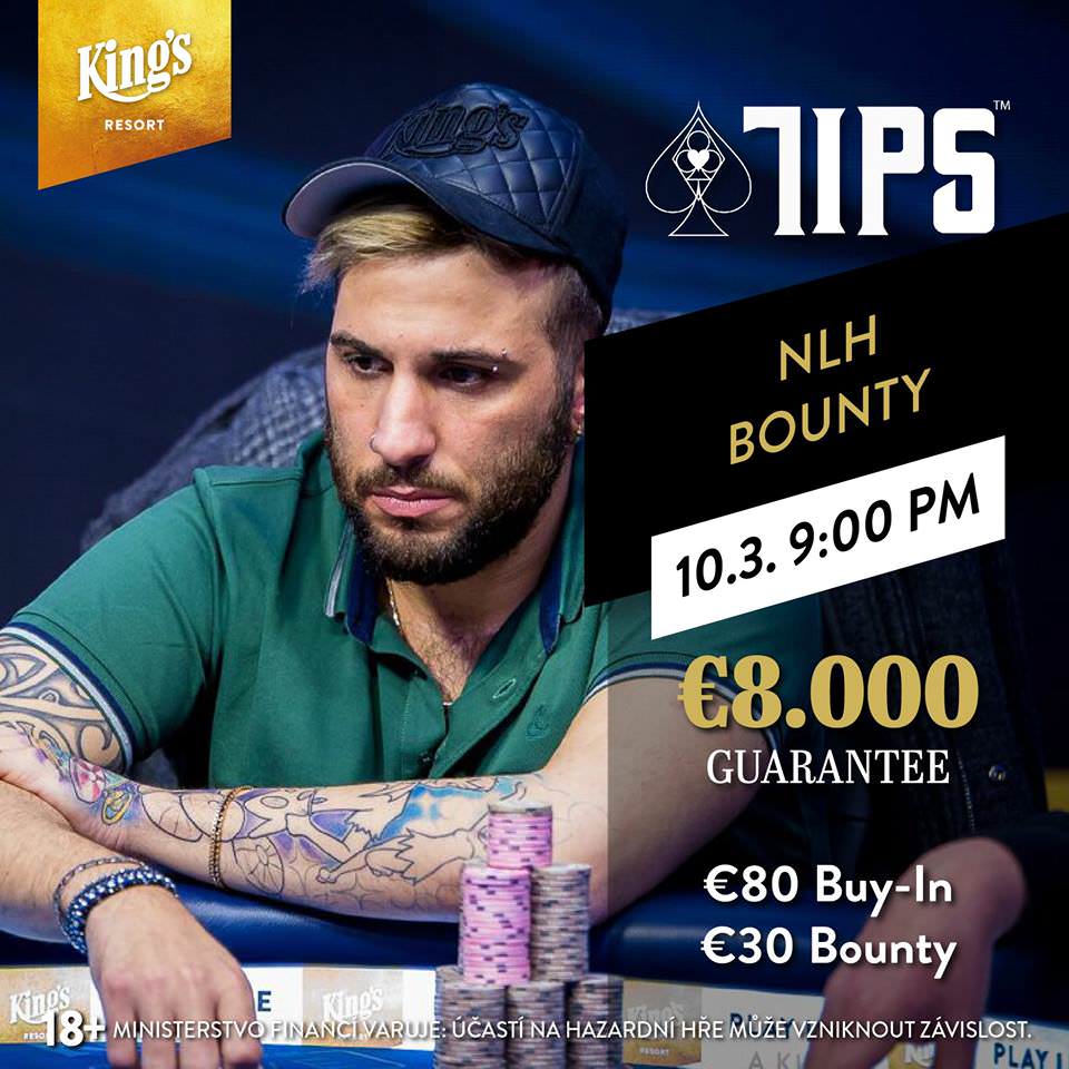 Zum Abschluss des Tages wird um 21:00 Uhr noch das €70+€30+€10 TIPS NLH Bounty Event gespielt, bei dem es um mindestens €8.000 geht. Hier gibt es für jeden Gegner den man aus den Weg räumen kann ein Kopfgeld in Höhe von €30. Man startet mit 20.000 in Chips und jeder Level dauert 20 Minuten. Ein Re-Entry ist möglich und die Late-Registration ist bis zum Ende von Level 8 geöffnet.
