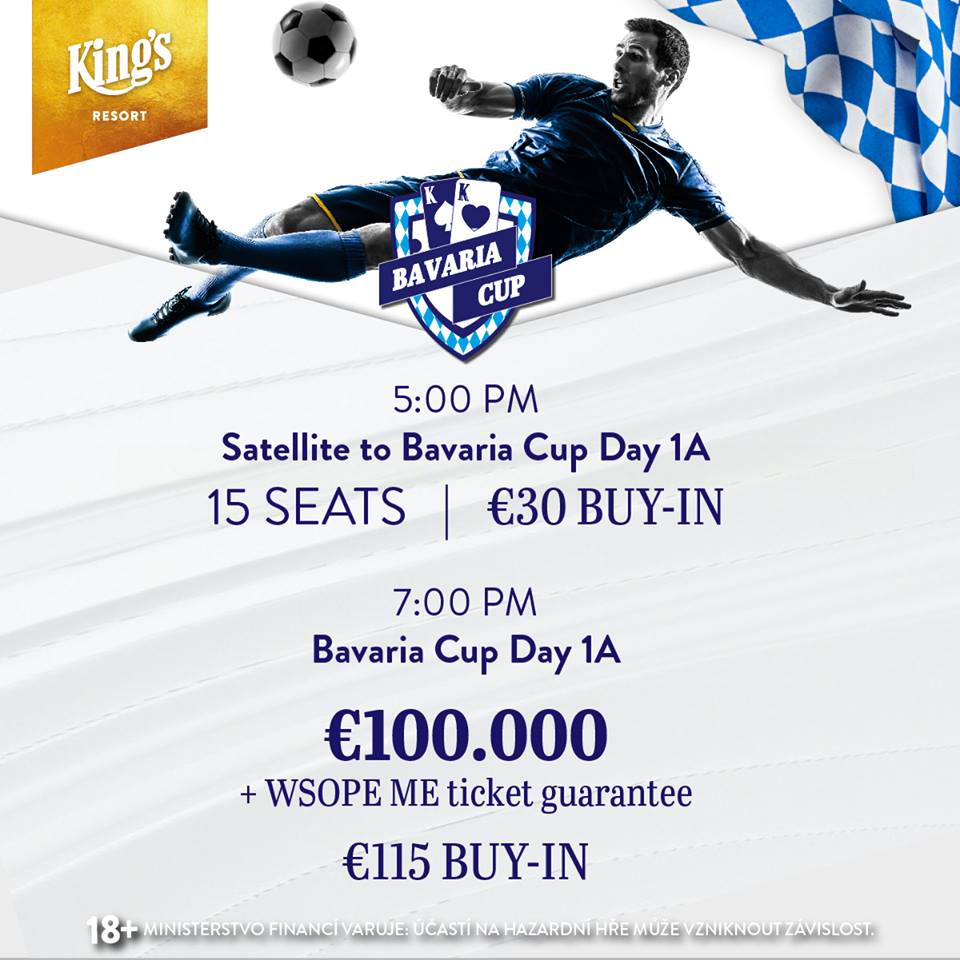 Der erste von insgesamt fünf Starttagen Eins des €100+€15 Bavaria Cup startet um 19:00 Uhr. Bei dem Turnier wird ein Preisgeld von €110.350 (inklusive einem €10.350 WSOP Europe Main Event Ticket) garantiert. Der Starting Stack beläuft sich auf 40.000 und es werden 16 Levels à 30 Minuten gespielt. Es sind unlimited Re-Entries erlaubt und die Late-Registration ist für 12 Levels geöffnet. Das Finale findet am Donnerstag ab 16:00 Uhr statt.