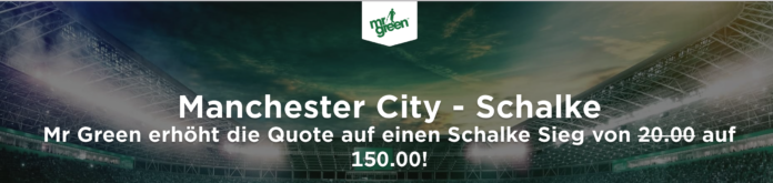Am Dienstagabend um 21 Uhr steht für den FC Schalke 04 das wichtige Achtelfinal-Rückspiel in der UEFA Champions League gegen Manchester City an. Trotz bärenstarker Leistung haben die Königsblauen das Hinspiel in der Veltins Arena nach 2:1-Führung noch aus der Hand gegeben und mit 2:3 verloren. Beim zweiten Aufeinandertreffen heute Abend ist die Tedesco-Elf in der Pflicht und MUSS im Etihad Stadium einen Sieg einfahren. Grund genug für MrGreen die Quote für einen Schalker-Erfolg in Manchester auf verrückte 150 zu erhöhen.