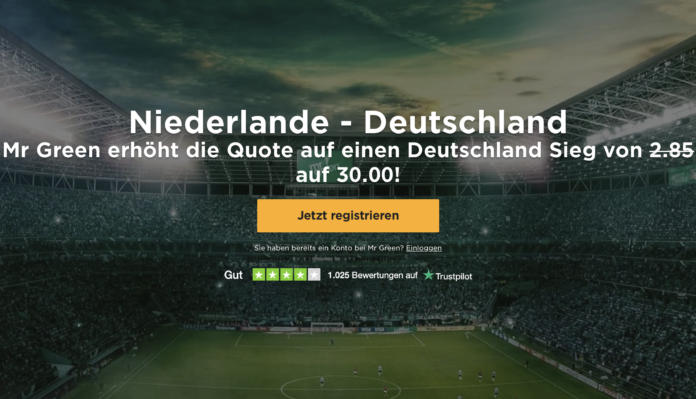 Nach der überschaubaren Leistung der deutschen Mannschaft beim 1:1 gegen Serbien startet am Sonntag für Löw’s Team die EURO Qualifikation mit einem Klassiker gegen die Niederlande. Das Online Casino und Neo-Sportwetten Anbieter MrGreen hat für Neukunden ein ganz besondere Quote im Angebot. Sollte Deutschland auswärts gegen die Niederlande gewinnen, bekommt ihr die unglaubliche Quote von 30,00, bei den meisten anderen Anbietern gibt es derzeit um die 2,80-3,00 auf einen Sieg von Deutschland.