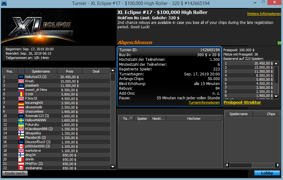 | 19h | #26 | Mini DeepStack | $20K | $16,50 |
