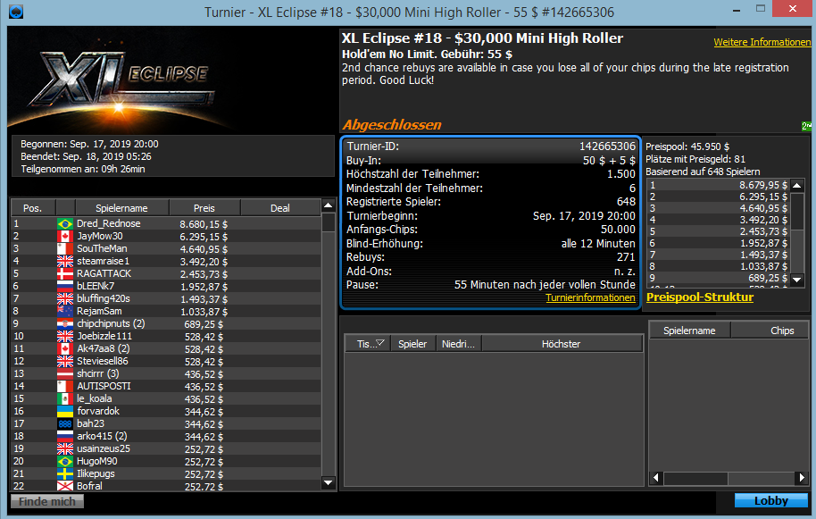 Beim $55 Mini High Roller erzeugten 699 Starts einen Preispool von $34.950. Am Ende musste sich „RasAlGhul“ aus Deutschland nur dem Kanadier „69Grank87“ geschlagen geben und wurde Runner-Up für $4.893. Für den Sieg gab es für den Kanadier $6.640. Bei diesem Turnier schaffte es der Österreicher „iBustYa888“ Platz 9 für $580 zu belegen.