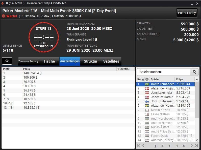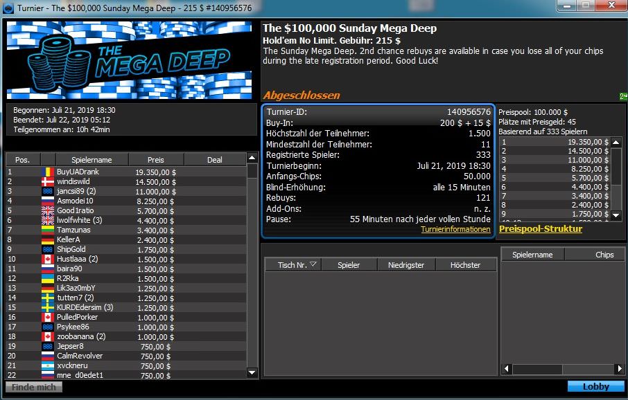 Auch das $215 Mega Deep war mit 679 Entries gut besucht. Hier konnte sich der Schwede „Madeon1994“ durchsetzen und bekam ein Preisgeld von $25.802. Der Österreicher „IOwnU888“ belegte hier Platz 3 für $13.919.