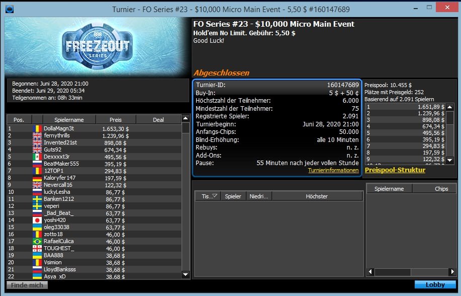 Die größte Beteiligung gab es mit 3.527 Entries beim $5,50 Micro Main Event. Der Sieg und $2.461 gingen nach einem Heads Up Deal an den Ukrainer „ExValue1„.
