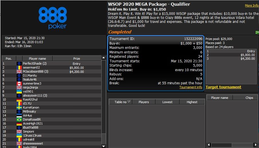 Wie an jedem Sonntag wurden auch wieder $12.600 Packages beim $1.050 WSOP Las Vegas 2019 Qualifier ausgespielt. Die zwei Pakete gingen an „ROBBIEMAC01“ und Ex-Weltmeister und 888 Poker Pro Martin „MJacobson888“ Jacobson (SWE). Dominik „888Dominik“ Nitsche (GER) belegt Platz 5 und bekam noch $1.960.