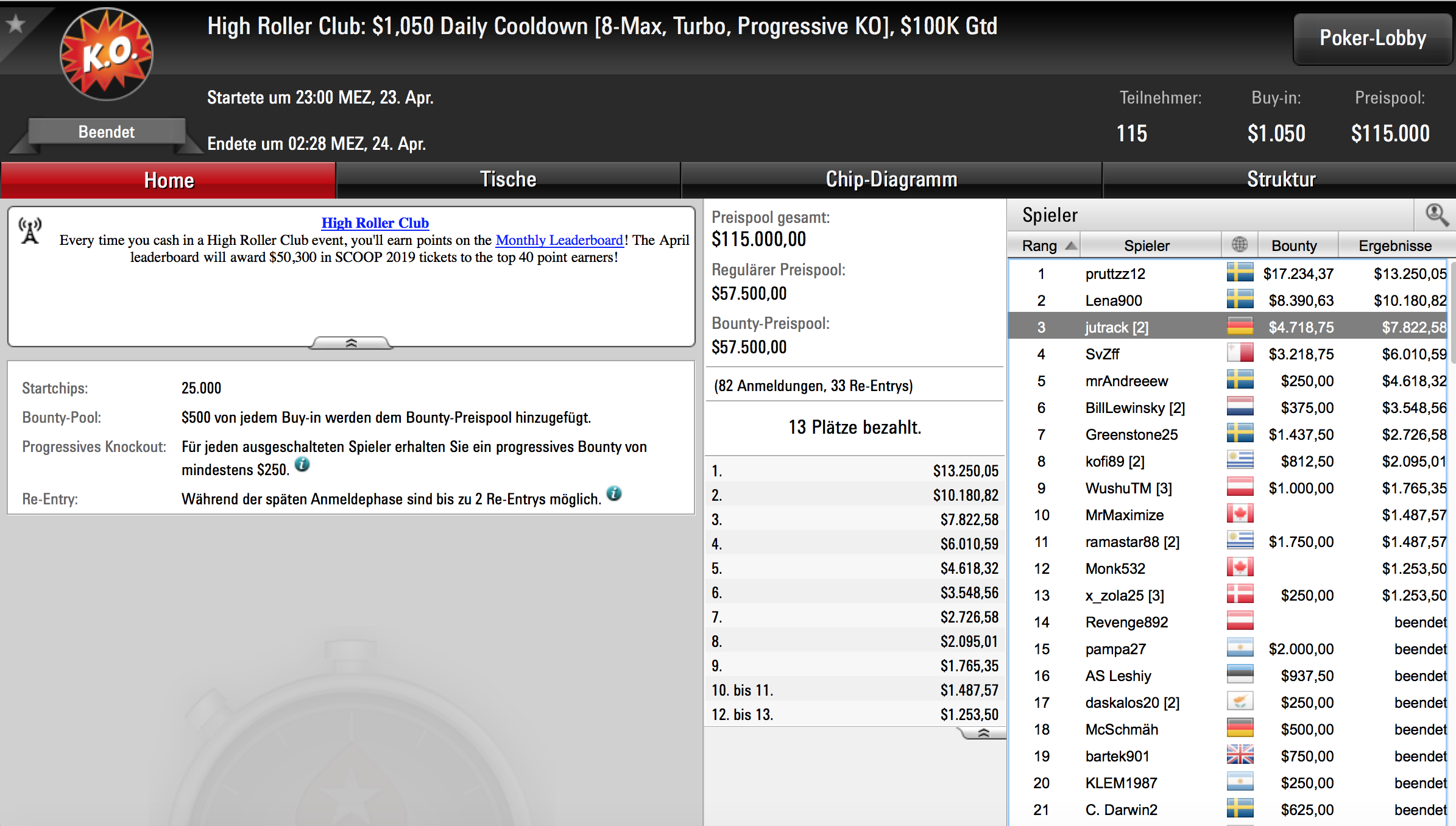Ergebnisse der High Roller Club Turniere vom 23. April 2019