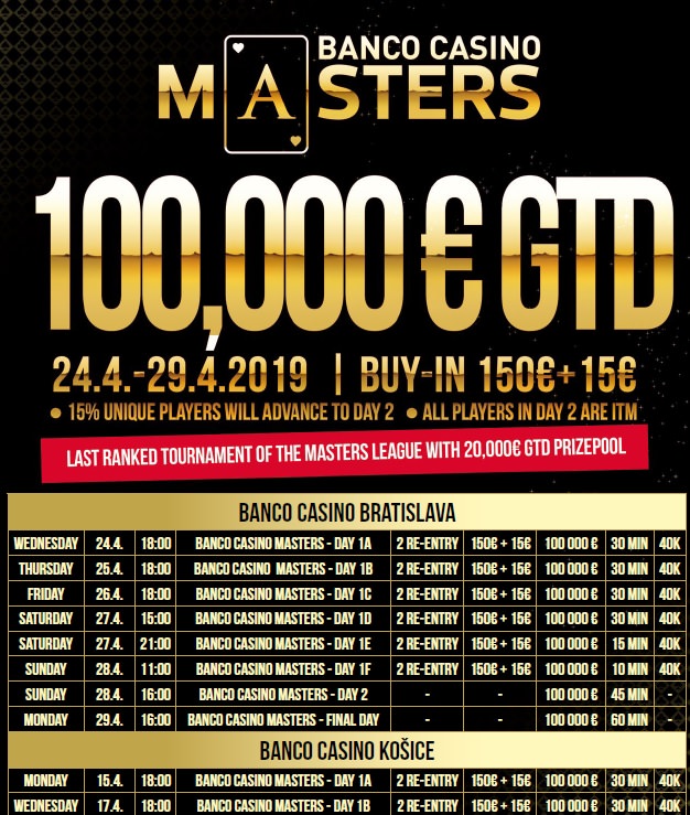 Am Donnerstag geht es im Banco Casino Bratislava um 18:00 Uhr mit dem Tag 1b weiter. Man erhält einen Starting Stack von 40.000 und jeder Level dauert 30 Minuten. Die Late-Registration ist bis 01:15 Uhr geöffnet. Es wird solange gespielt bis noch 15% der Entries im Turnier sind. Alle Spieler die es in Tag 2 schaffen haben schon den Min Cash sicher.