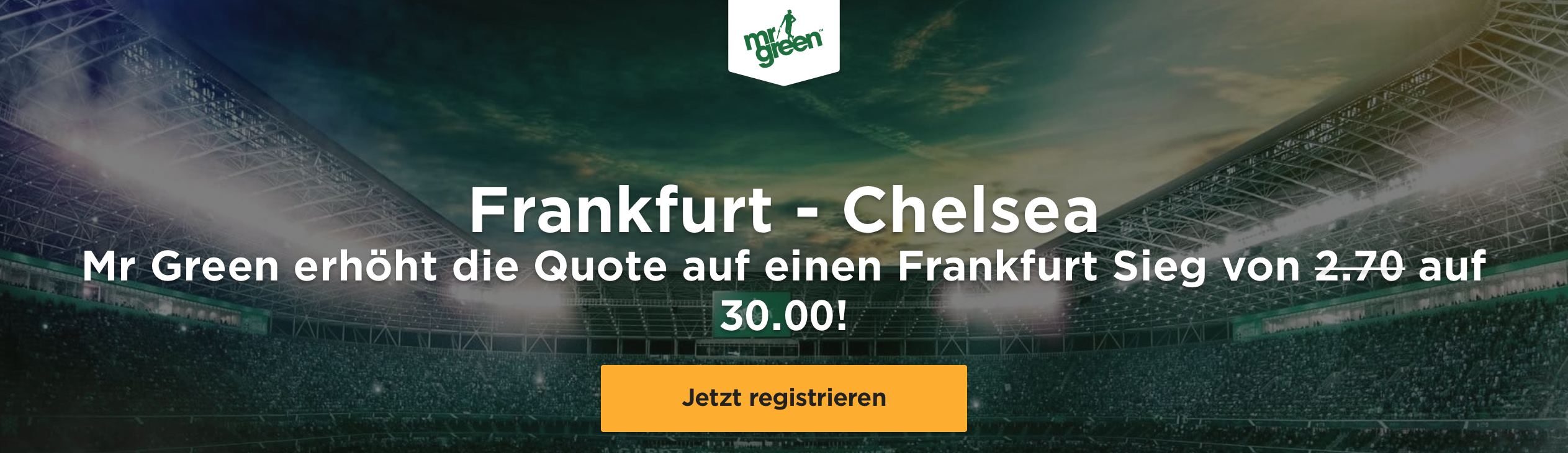 Geht das Märchen der Frankfurter Eintracht im Halbfinale der Europa League weiter? Am Donnerstagabend wissen wir mehr, wenn die Frankfurter gegen den englischen Vertreter FCChelsea in der Commerzbank-Arena (Start 21 Uhr) das Hinspiel bestreiten werden. Um für das erste Halbfinalspiel die Spannung noch zu erhöhen, bietet der preisgekrönte Gaming-Anbieter MrGreen Neukunden eine absolute Traumquote auf einen Frankfurt-Sieg von 30.00.