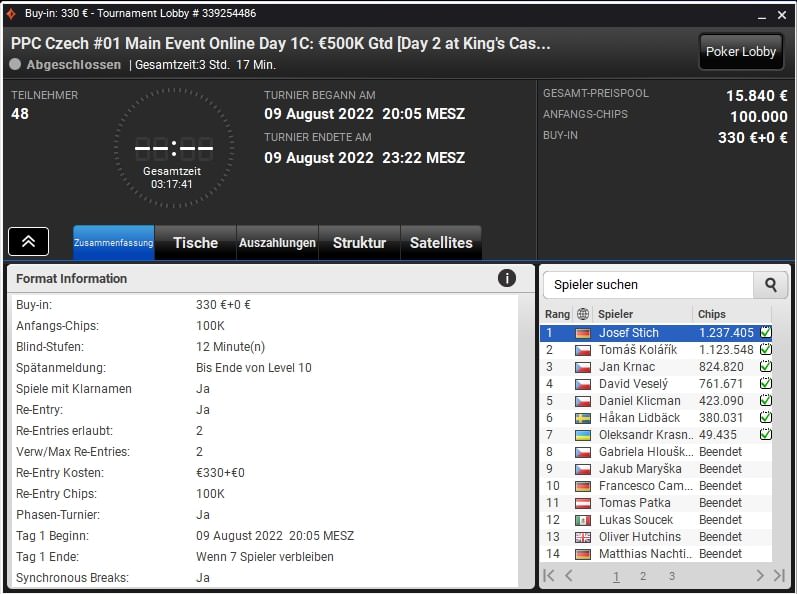 Für die bereits qualifizierten Spieler geht es am Sonntag um 15:30 Uhr mit dem Live-Tag 2 weiter. Dann startet Level 19 mit den Blinds 10.000/20.000 (Button Ante). Die Levelzeiten betragen dann 30 Minuten. Der Average nach Online-Flight 1c beträgt 905.555 (45 Big Blinds).