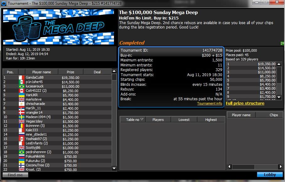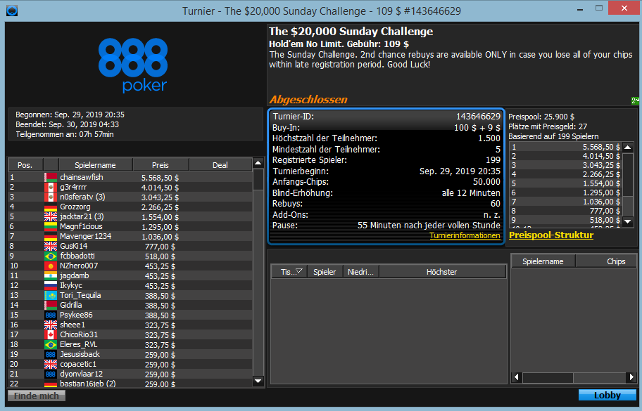 Auf 888poker gab es am Sonntag wie gewohnt den Sunday Grind. Das größte Event war wieder Mal das $215 Mega Deep mit 285 Spielern (+103 Re-Entries). Hier ging es um das garantierte Preisgeld von $100.000. Der Kanadier „guydeet39“ konnte das Turnier für ein Preisgeld von $20.450 gewinnen. Bereits am 01. April 2019 konnte er dieses Turnier für sich entscheiden. Poker-Pro Kenny “ SpaceyFCB“ Hallaert belegte Platz 7 für $3.500. Bester Deutscher wurde „KlongKlong86“ auf Platz 8 für $2.500.